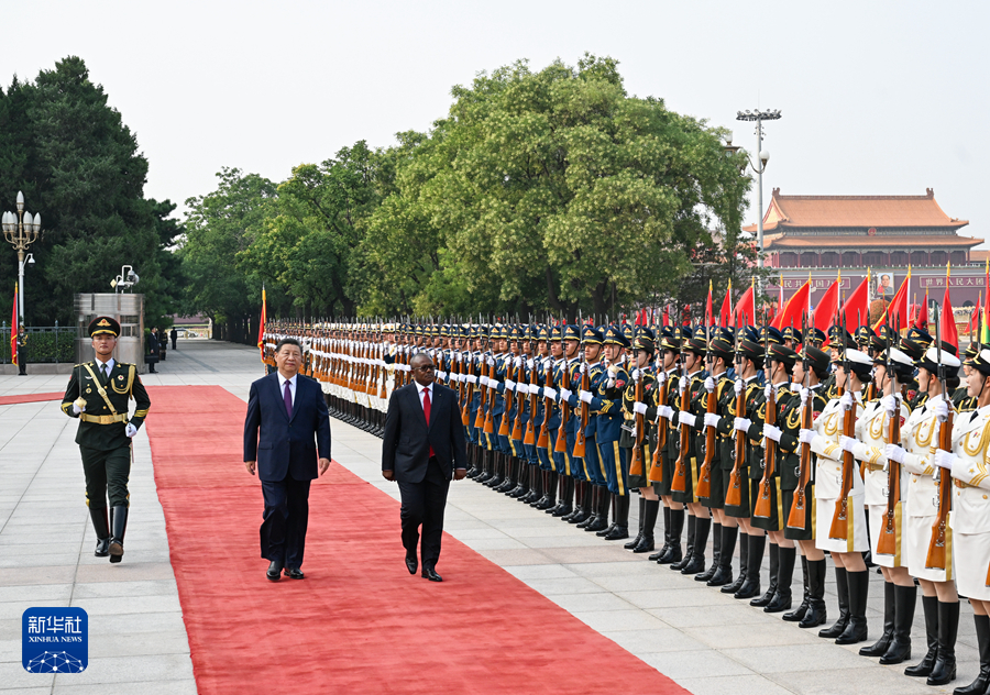 ??恩巴洛抵達(dá)時(shí),禮兵列隊(duì)致敬。兩國元首登上檢閱臺(tái),軍樂團(tuán)奏中國和幾內(nèi)亞比紹兩國國歌,天安門廣場(chǎng)鳴放21響禮炮。恩巴洛在習(xí)近平陪同下檢閱中國人民解放軍儀仗隊(duì),并觀看分列式。